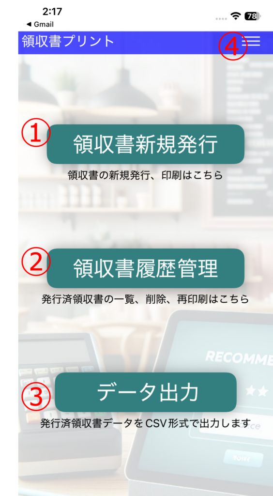- 本アプリの使い方:Webブラウザが起動し、アプリマニュアルが表示されます。