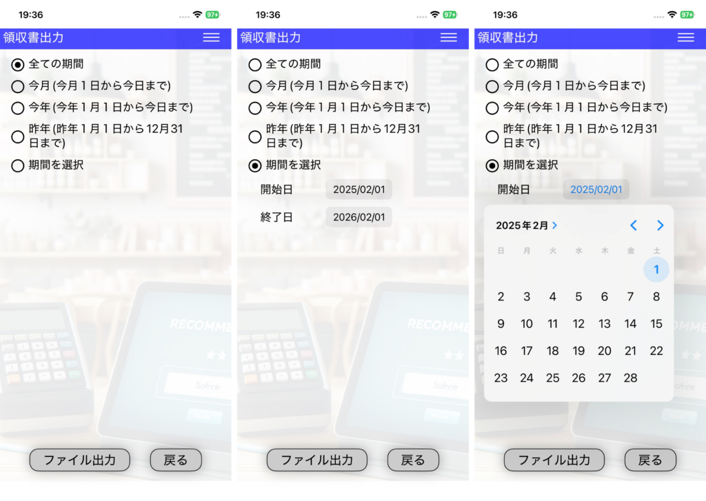 次の画面で、出力する期間の選択を行います。ただし「今月」以外はプレミアム機能(有料)となります。