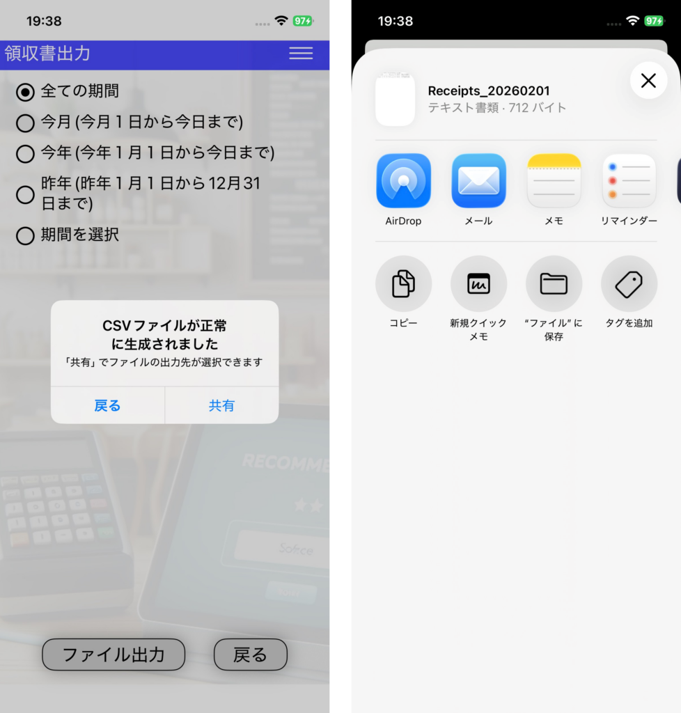 出力したい期間を選択したら、画面下部の「ファイル出力」を選択します。ファイルが生成されると、ポップアップウィンドウが出るので、「共有」を選択し、出力先の選択をしてください。「戻る」を選ぶと、生成されたCSVファイルは破棄されますので、必ず共有先を選択してください。